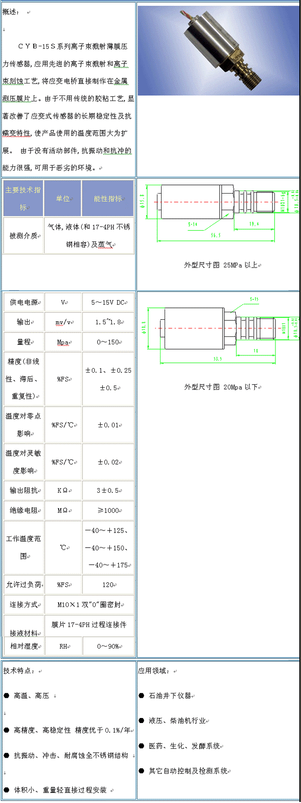 CYB-15S 濺射薄膜壓力傳感器(pressure sensor):